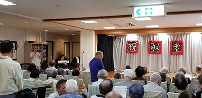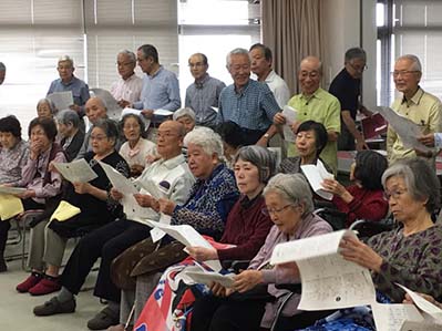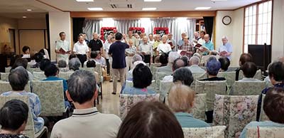 流山にある老人養護施設への慰問コンサート。男声合唱団フロイデの地域活動の一環。土曜日のせいか渋滞して15分遅れの開催となった。施設の皆さんを前にして熱意のこもった演奏ができた。皆んなで愛唱歌を歌ったり、2月の前後に誕生日を迎える6人の人にハッピーバースデイを歌ったり、楽しいひと時を過ごしました。 |