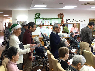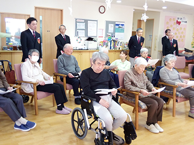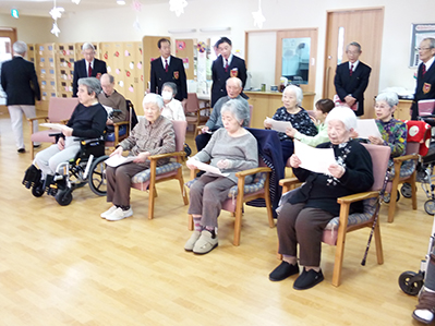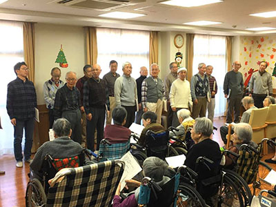 流山にある老人養護施設への慰問コンサートに参加した。男声合唱団フロイデの地域活動の一環。年末のせいか集まったのは20人前後だったが、施設の皆さんを前にして一生懸命に演奏した。今月誕生日を迎える4人の方々をハピバ❣️の歌でお祝いしたり、皆んなで愛唱歌を歌うなど有意義なひと時を過ごした(S氏のfacebookより) |