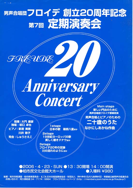 第7回定期演奏会柏市民文化会館 大ホール 創立20周年記念演奏会 2006年4月23日 「フロイデ20年の足跡」 「川の流れのように」 フロイデ委嘱初演 男声合唱とピアノのための 「二十歳のうた」 |