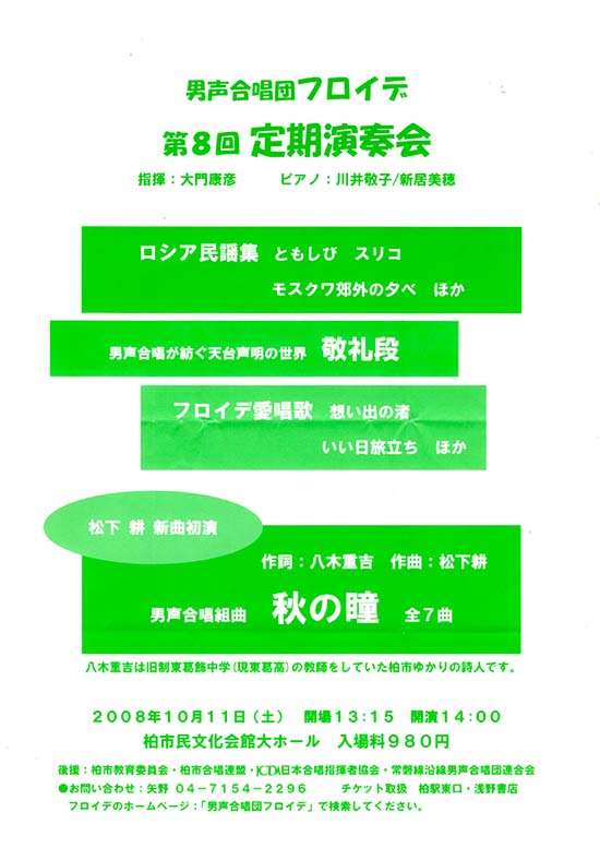第8回定期演奏会2008年10月11日 柏市民文化会館 大ホール ロシア民謡集 松下 耕 新曲初演 男声合唱組曲 「秋の瞳」 全7曲 |