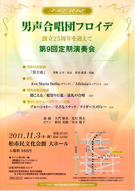第9回定期演奏会2011年11月3日 柏市民文化会館 大ホール 男声合唱組曲 「富士山」 懐かしのグループサウンド 曲集「ブルーシャトー」 ほか |